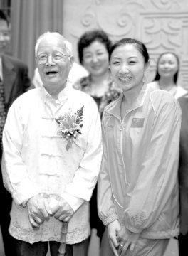 鄧鐵濤(左)與奧運(yùn)蹦床冠軍何雯娜合影