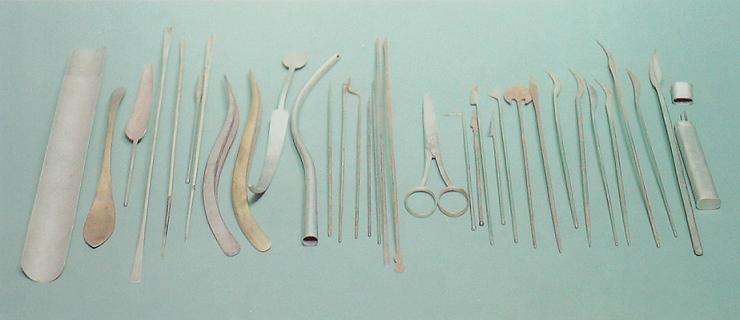 【中醫(yī)外科用具】 清末。 銅質(zhì)。最長(zhǎng)25cm,最短11.5cm。包括刀、剪、鑷、探針、藥勺等35種。系北京魯氏老中醫(yī)家傳四代之物。 北京中醫(yī)藥大學(xué)醫(yī)史博物館藏